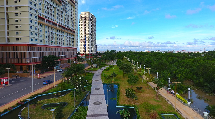 Nằm trong khu dân cư hiện hữu nên mọi tiện ích đã hoàn thiện: siêu thị Auchan, Vinmart, khu vui chơi trẻ em, phòng gym, salon và spa, khu vui chơi trẻ em, sân tập bóng rổ, công viên dọc bờ sông dài tới 1,3 km…