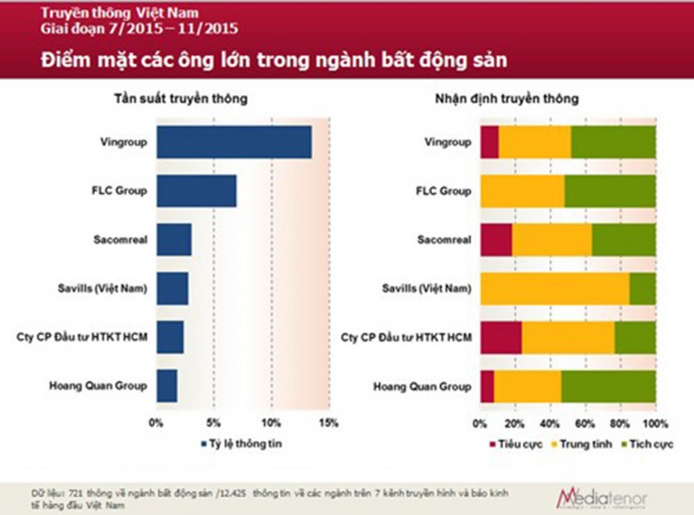 Đáng chú ý, các tập đoàn ngành nhà đất dẫn đầu về tần suất xuất hiện là VinGroup, FLC, Sacomreal và Savills. Riêng VinGroup và FLC đã chiếm đến hơn 20% tần suất truyền thông của ngành BĐS, và đến 50% là thông tin tích cực – tỷ lệ thuận với uy tín và danh tiếng của 2 đơn vị này. Còn với Sacomreal, đây là DN được thị trường đánh giá có phong cách truyền thông trẻ, năng động, phù hợp với kế hoạch đa dạng hóa các dòng sản phẩm từ cao cấp, trung bình, từ biệt thự nghỉ dưỡng đến nhà ở thương mại… của DN. Savills là DN tư vấn, quản lí dự án thực tế đã hoạt động tích cực ở mọi phạm vi của mình.