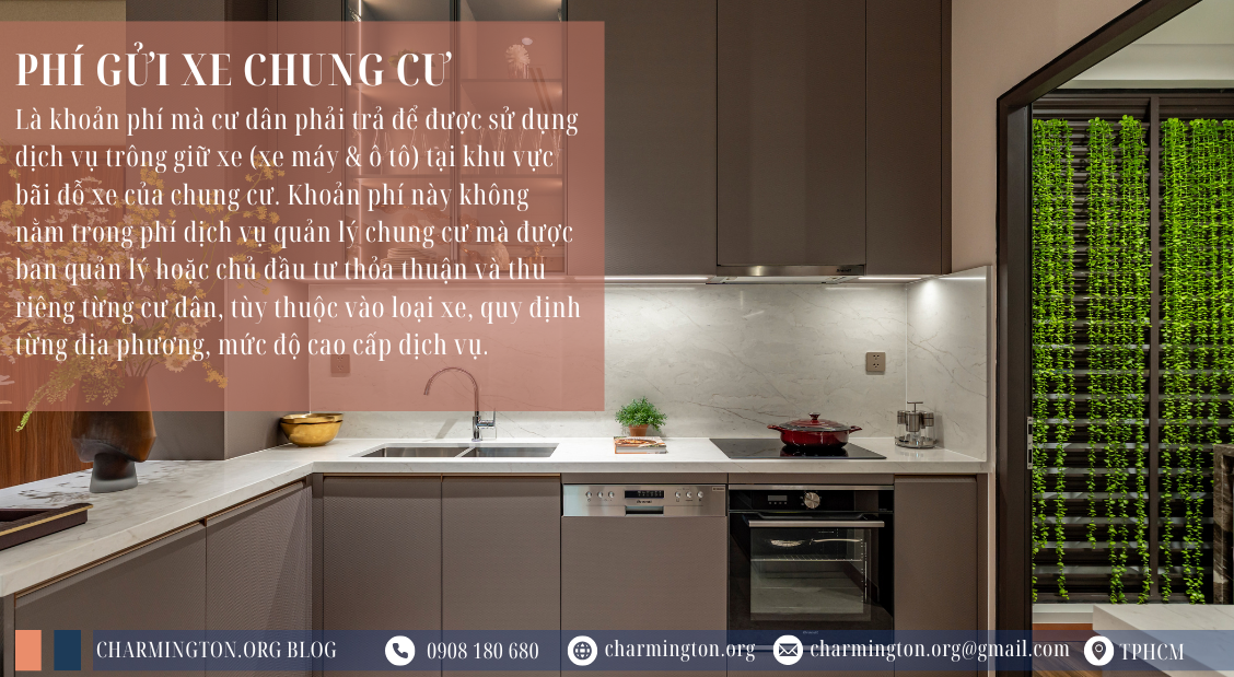 Là khoản phí mà cư dân phải trả để được sử dụng dịch vụ trông giữ xe (xe máy & ô tô) tại khu vực bãi đỗ xe của chung cư. Khoản phí này không nằm trong phí dịch vụ quản lý chung cư mà được ban quản lý hoặc chủ đầu tư thỏa thuận và thu riêng từng cư dân, tùy thuộc vào loại xe, quy định từng địa phương, mức độ cao cấp dịch vụ.