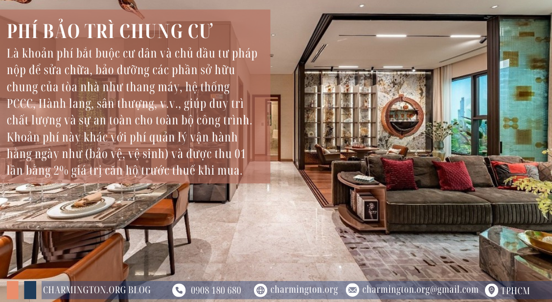 Charmington.org | Ngoài chi phí mua căn hộ ra, khách hàng muốn sở hữu căn hộ và ở lâu dài cần tính đến các khỏa phí cố định & không cố định hàng tháng như: Phí bảo trì, Phí quản lý, Phí gửi xe, Phí thẩm định cấp sổ, Phí trước bạn, Phí Điện - Nước - Internet. Chi tiết bên dưới.