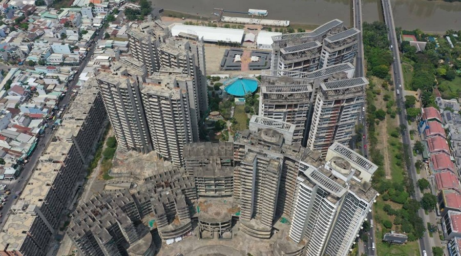 Tuy nhiên, khi một phần dự án đã xây dựng xong phần thô và đi vào hoàn thiện thì ngưng thi công và đắp chiếu suốt nhiều năm sau đó. Nguyên nhân, dự án đình trệ một phần do ảnh hưởng của thời kỳ khủng hoảng thị trường bất động sản. Suốt nhiều năm trời dự án chỉ là những khối bê tông khổng lồ xám xịt, gây tiếc nuối cho nhiều người khi đi qua tuyến đường Nguyễn Hữu Thọ.