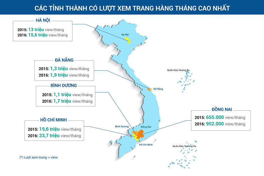 Các nghiên cứu của Batdongsan.com.vn chỉ ra lượng tìm kiếm thông tin bất động sản tại Hà Nội và Tp.HCM luôn dẫn đầu cả nước với 32,6 triệu lượt xem trang năm 2015, chiếm tới gần 80% tổng lượng xem trang trên Batdongsan.com.vn của cả nước. Các tỉnh thành Đà Nẵng, Bình Dương, Hải Phòng là những điểm nóng tiếp theo về lượng tìm kiếm bất động sản. Đáng chú ý là tỉnh Đồng Nai đã nổi lên như 1 hiện tượng hấp dẫn người mua, các nhà đầu tư khi chiếm giữ vị trí thứ 5 về mức độ quan tâm đến BĐS.