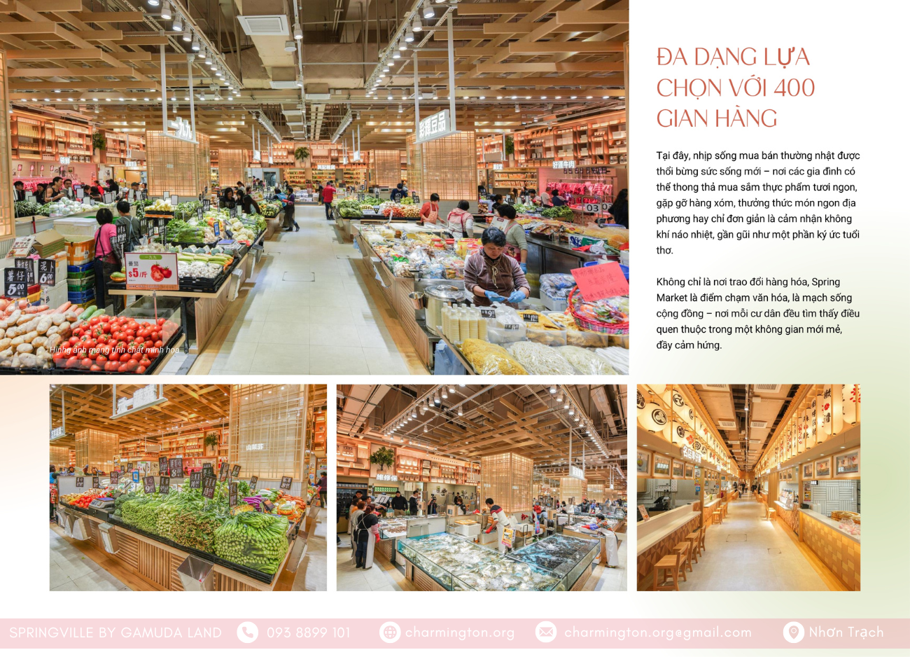 Theo chủ đầu tư, hạng mục đầu tiên phải kể đến chính là ngôi chợ kiểu mới đặc sắc Spring Market. Spring Market sẽ là sự giao thoa độc đáo giữa nét truyền thống và kiến trúc hiện đại. Với quy mô trên 7.800m2, không gian chợ sẽ được thiết kế linh hoạt và sáng tạo, mang đến một trải nghiệm mua sắm hoàn toàn mới mẻ nhưng vẫn giữ được sự gần gũi vốn có.
