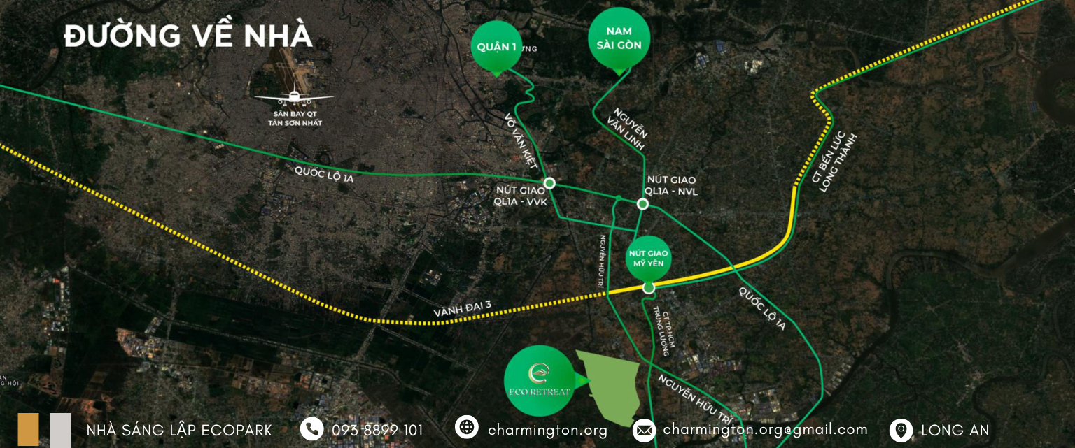 Vị trí của Eco Retreat nằm ở Bến Lức – cửa ngõ phía Tây TP.HCM – được xem là một lợi thế lớn. Dự án có kết nối nhanh chóng với trung tâm qua các tuyến cao tốc như TP.HCM – Trung Lương cùng với hệ thống Vành đai 3 và Vành đai 4 trong tương lai. Điều này không chỉ rút ngắn thời gian di chuyển mà còn mở ra tiềm năng tăng trưởng mạnh mẽ, khi theo báo cáo CBRE Việt Nam, các dự án gần các tuyến giao thông huyết mạch thường có khả năng tăng giá từ 20-30% mỗi năm. Bên cạnh đó, quy hoạch vùng TP.HCM đến năm 2030 định hướng Bến Lức trở thành trung tâm kinh tế đô thị quan trọng, thu hút hàng loạt chủ đầu tư lớn như Vingroup, Novaland, Nam Long.
