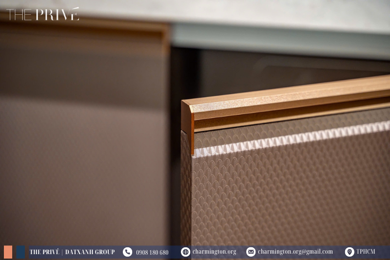 Không gian tại The Privé được hoàn thiện bằng chất liệu laminate vân vảy rồng với hiệu ứng 3D, tạo chiều sâu thị giác và cảm giác sang trọng vừa đủ.