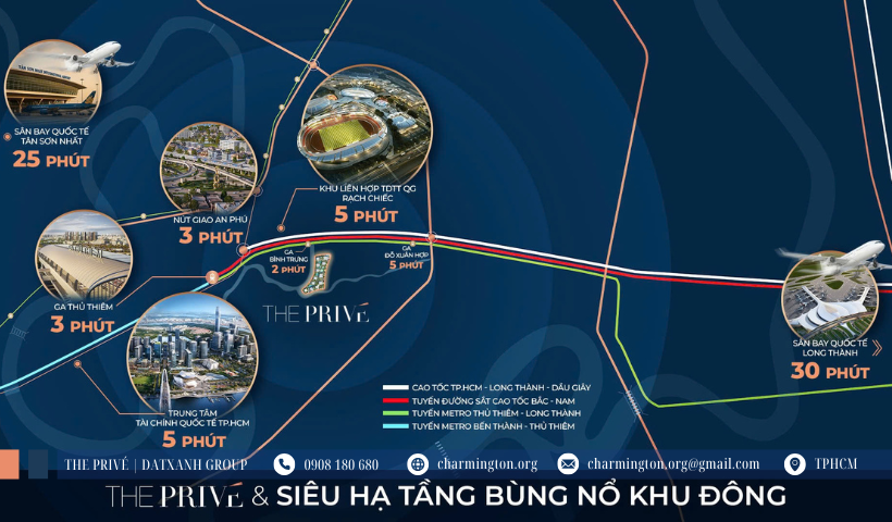 Sở hữu vị trí đắt giá tại trung tâm Nam Rạch Chiếc, The Privé kết nối hoàn hảo với các trục huyết mạch như Đại lộ Mai Chí Thọ, Lương Định Của, Cao tốc TP.HCM – Long Thành – Dầu Giây. Đặc biệt, dự án tiếp cận cùng lúc hai tuyến metro chiến lược: tuyến số 1 (Bến Thành – Suối Tiên) và tuyến số 2 (dự kiến khởi công cuối 2025). Đây là yếu tố chiến lược không chỉ tạo điều kiện kết nối ưu việt, mà còn khẳng định giá trị đầu tư dài hạn và khả năng gia tăng giá trị tài sản theo thời gian.