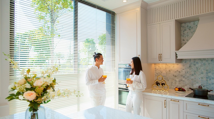 Mỗi căn biệt thự có ba phòng ngủ rộng rãi và thoáng đãng, các cửa kính lớn đón nắng tự nhiên. Các cặp vợ chồng có thể vừa đọc sách, vừa ngắm không gian yên tĩnh bên ngoài.